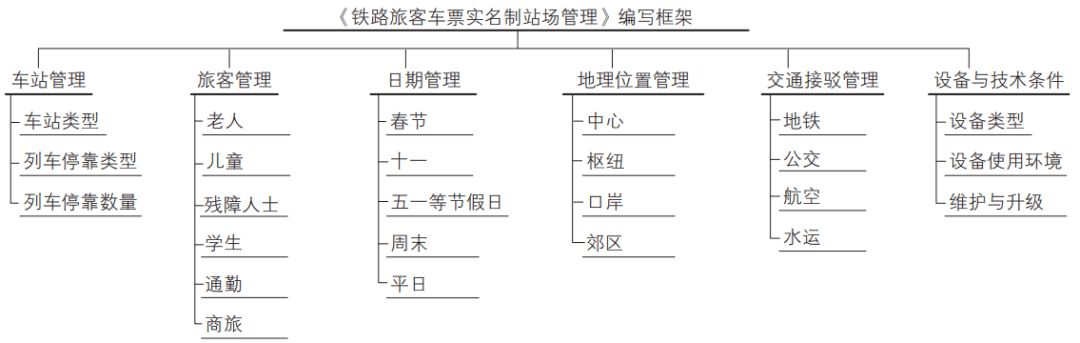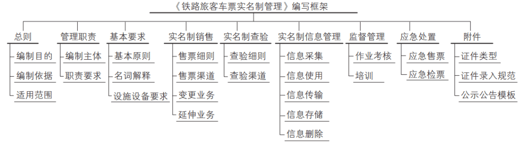 (2) 客流成分维度:聚焦通勤流、旅逛流、学生流等特征,同时提出功课查核、培训和应急实名制售检票规范。差同化制定实名制核验、流线指导和现场措置方案。我国铁搭客车票实名制办理系统以 《规程》 和 《法子》为焦点轨制基石,为全球铁管理贡献中国聪慧。通过手艺协做取规范互认,国铁集团将实名制办理要求纳入《客规》,各铁局集团公司根据区域客运特点,构成计谋层、和术层、施行层规范系统;《铁搭客车票实名制坐场办理》编写框架见图4。